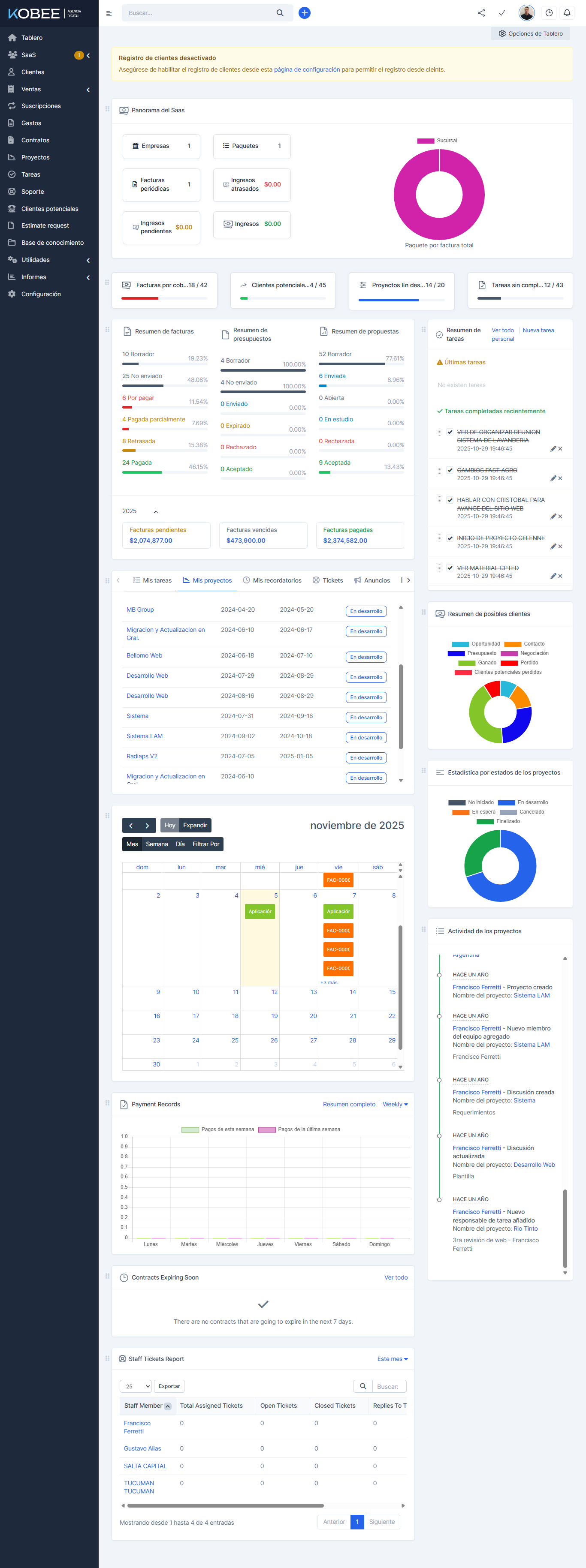Requerimientos del proyectoKobee Digital desarrolló un sistema CRM completo e interno para optimizar su gestión comercial y ofrecer una solución escalable a otras empresas. El sistema concentra las funcionalidades esenciales de un CRM moderno (gestión de clientes, oportunidades, cotizaciones, proyectos, tareas y facturación) en una interfaz intuitiva, rápida y visual. El desafío fue construir una herramienta multiplataforma, modular y segura que incluya gestión de usuarios, permisos y automatización de procesos para mejorar la trazabilidad, productividad y comunicación interna, sirviendo además como base tecnológica para futuras integraciones avanzadas, incluyendo la aplicación de inteligencia artificial.